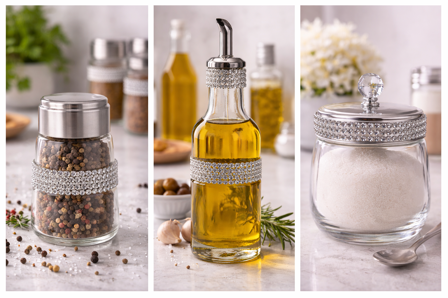 MOLINILLO DE PIMIENTA / BOTELLA DE ACEITE / FRASCO DE AZÚCAR CON PEDRERÍA